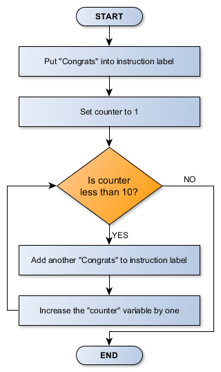 Here you can see a neat solution that would allow us to add the “Congrats” message 10,000 times if we wanted with one very minor change of our flowchart (and subsequent code). Now let’s see how this can be done in Visual Basic.